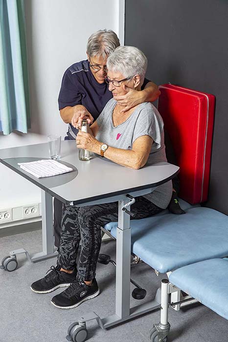 With the right aids in training, therapy and rehabilitation, the patients will experience faster progress in the rehabilitation, and the occupational therapist gets the optimum working positions. In consequence, the table helps both patients and professionals to get a better everyday life.