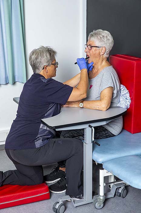 The patient is examined with a tactile examination of the mouth where sense of feeling and mouth movement, as well as saliva swallowing, is assessed. The patient sits in an active wheelchair with the foot supports de-mounted and with a pack under the feet as she otherwise would not be able to reach the floor. The arm supports are also de-mounted, and she has a pillow in the back to get an upright sitting position with the stomach towards the table edge and the weight on the forearms/elbows, which lie well supported on the table with the forearms/elbows on the table. In this example, the patient could also be sitting on an ordinary dining chair without arm supports with a pillow or wedge in the back and the feet on the floor.