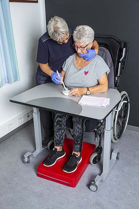 Annette Kjærsgaard is an occupational therapy specialist with a PhD in dysphagia. Dysphagia is a swallowing disorder and a symptom that may occur in connection with neurological diseases like Parkinson’s disease, sclerosis and brain injuries. In her latest book about dysphagia, Anette has made a series of professional descriptions, where she uses the ErgoMulti table for the rehabilitation of people with dysphagia.