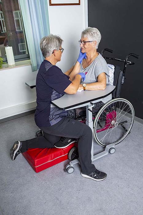 The design of the ErgoMulti table with carvings, brake wheels and the possibility for manual height adjustment makes it possible for the user to sit well supported with the feet on the floor, the stomach towards the table edge and the forearms/elbows on the table regardless of whether the user sits on an ordinary chair, an active or comfort wheelchair or a treatment bench.