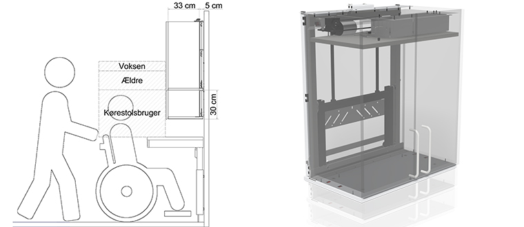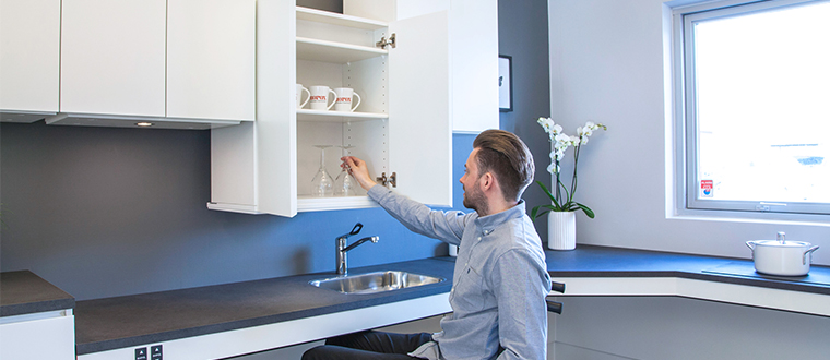 The system consists of a frame with a lifting unit, and when the cupboard is mounted, you get the flexibility that enables elderly and disabled people to become more self-reliant in the kitchen.