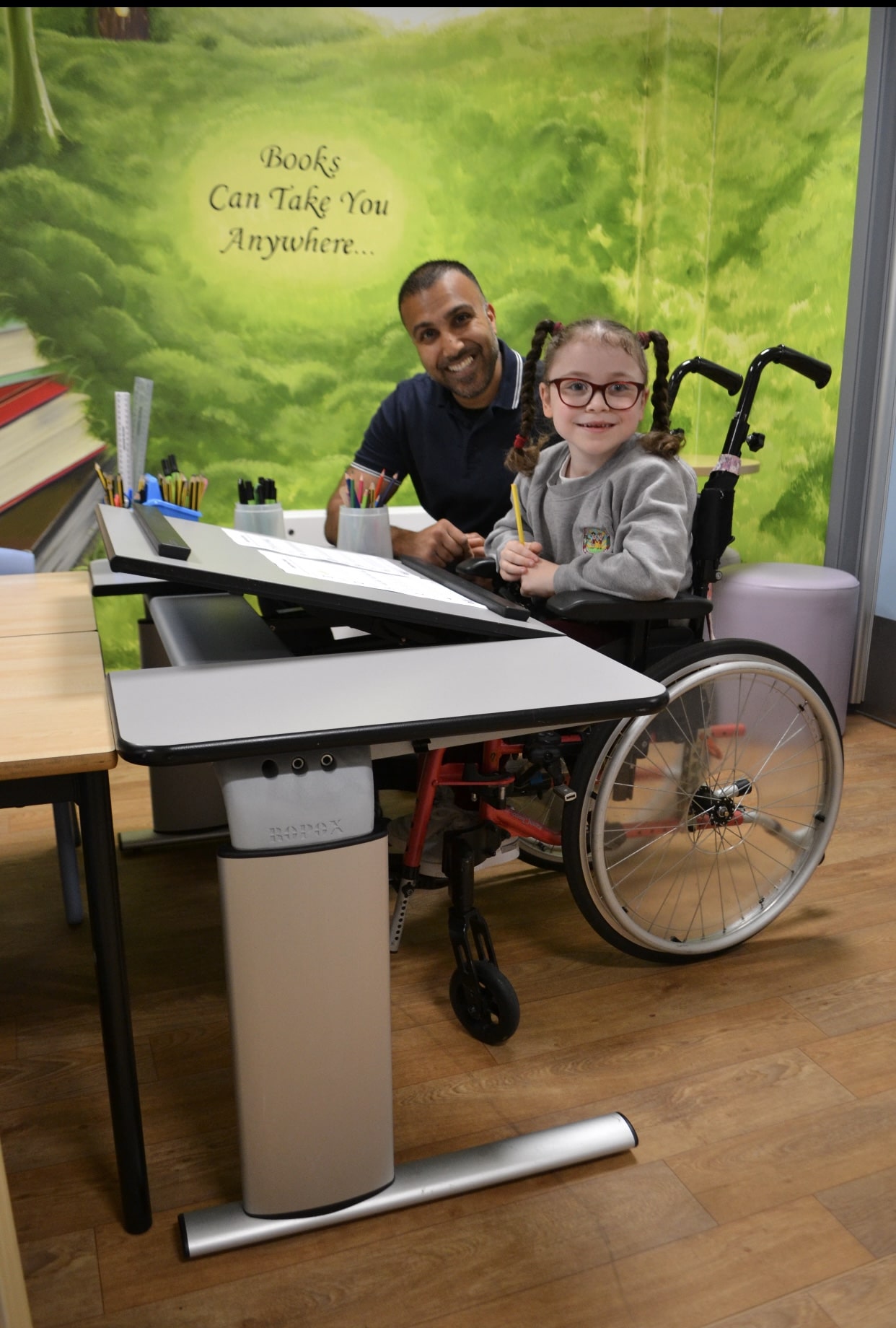 Her mobility limitations made it difficult to engage in activities like reading, writing, and colouring, impacting her educational experience and posture. Standard tables didn’t accommodate her needs, hindering her independence and comfort in the classroom.